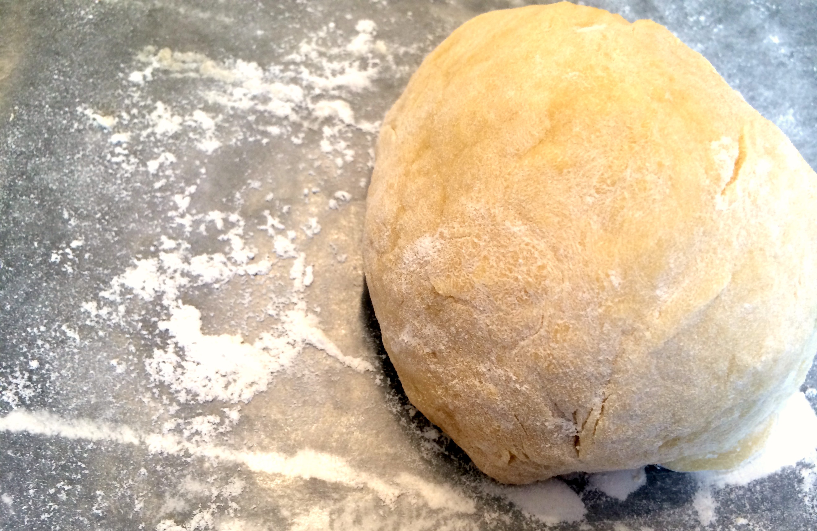 Eventually the eggs and flour will be completely mixed and will form a sticky ball.