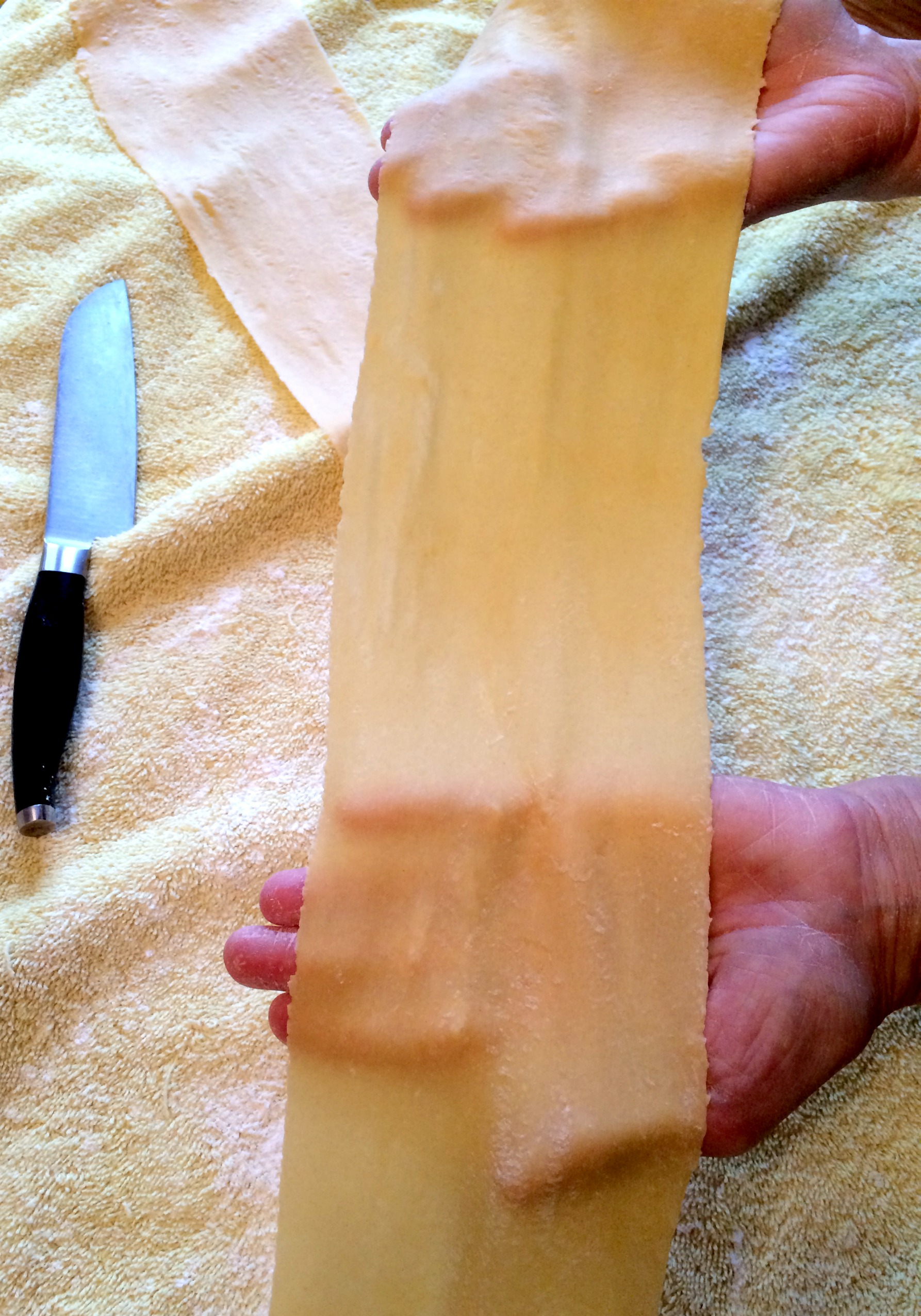 When it is thin enough, feed the dough through the fettuccine setting. If you do not have a pasta maker, you can use a knife to cut your desired width of pasta.
