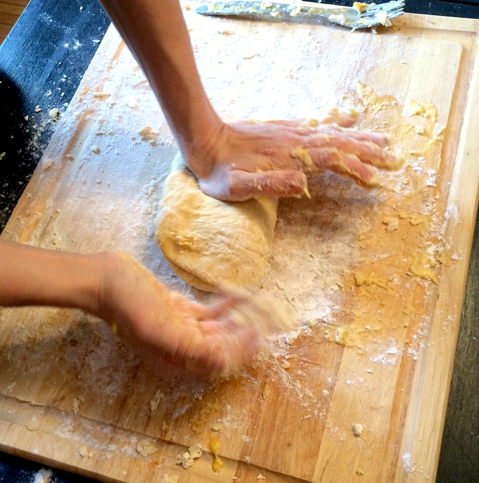 Using a fork in a stirring motion, slowly incorporate a small amount of flour into the center of eggs. Be careful not to break the circle of flour, the eggs will run all over the place! It happened to me…it was not enjoyable.