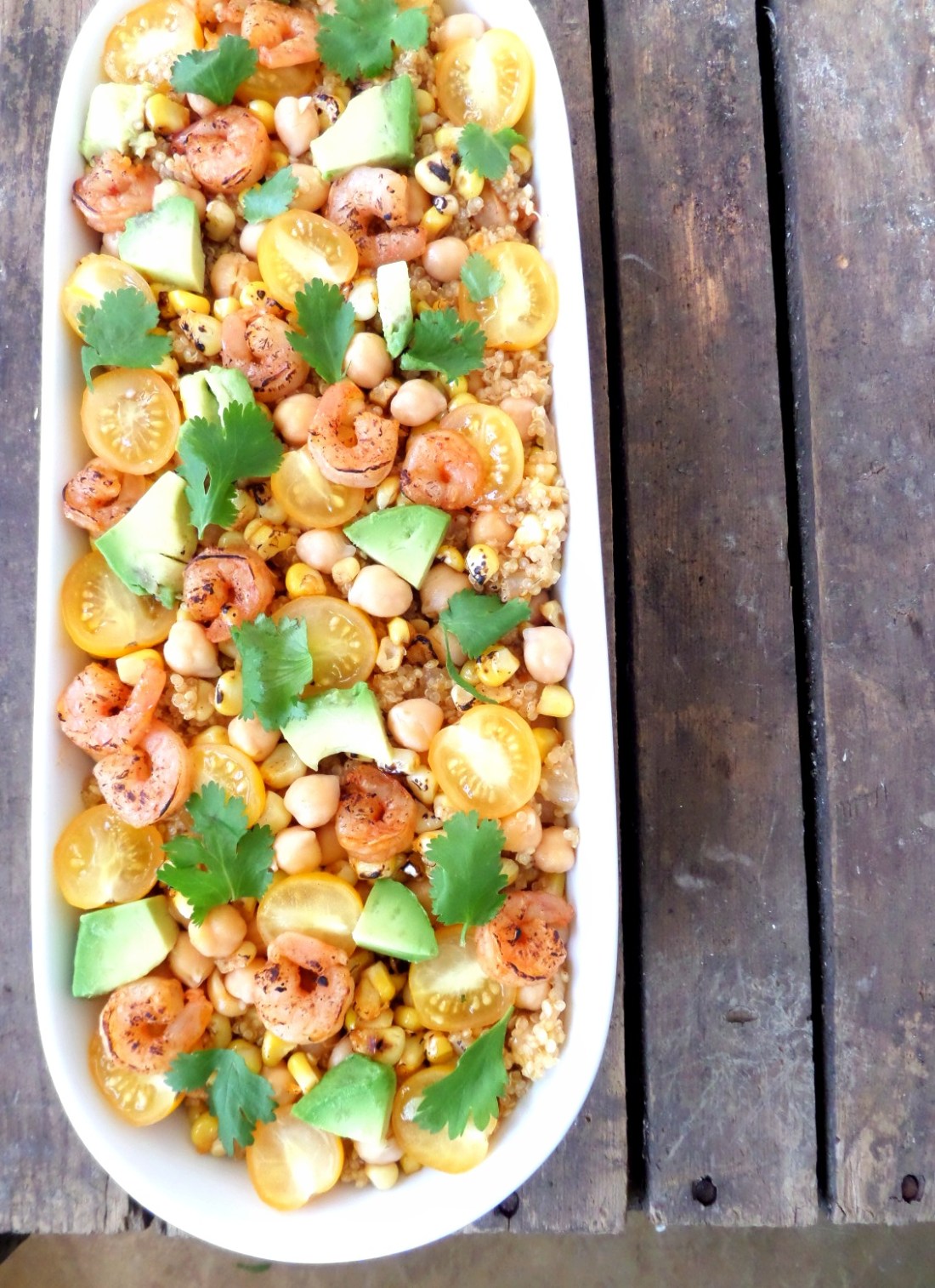 I loved the sweet crunch of the corn, juicy pop of the raw tomato, creamy texture of the avocado, citrus notes from the cilantro, meaty bite to the chickpeas, and of course the shellfish flavor from the shrimp. All of this goodness was wrapped in a downy bed of quinoa and tossed with a spicy snap of hot sauce. The salad can also be served cold and makes amazing left overs!