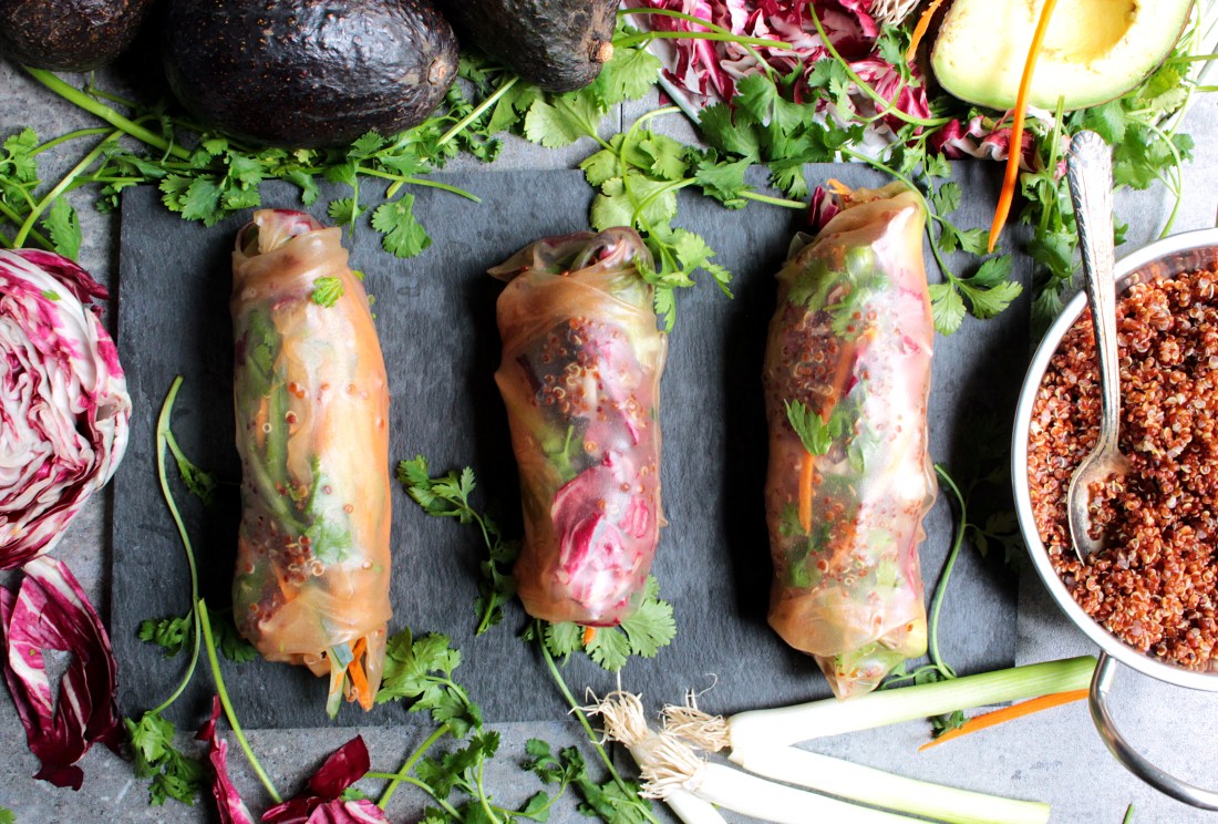 Fortunately, I have lost 9.2 pounds thus far, which makes me feel empowered. Unfortunately, I am craving burgers, fries and pizza in the worst way. Honestly, the only food that has kept me sane are these Quinoa Veggie Spring Rolls dipped in low-sodium soy sauce and doused in sriracha. Each raw vegetable contributes its own unique flavor and texture, making this meal intensely satisfying. Did I mention it’s SUPER easy and FUN to whip up?