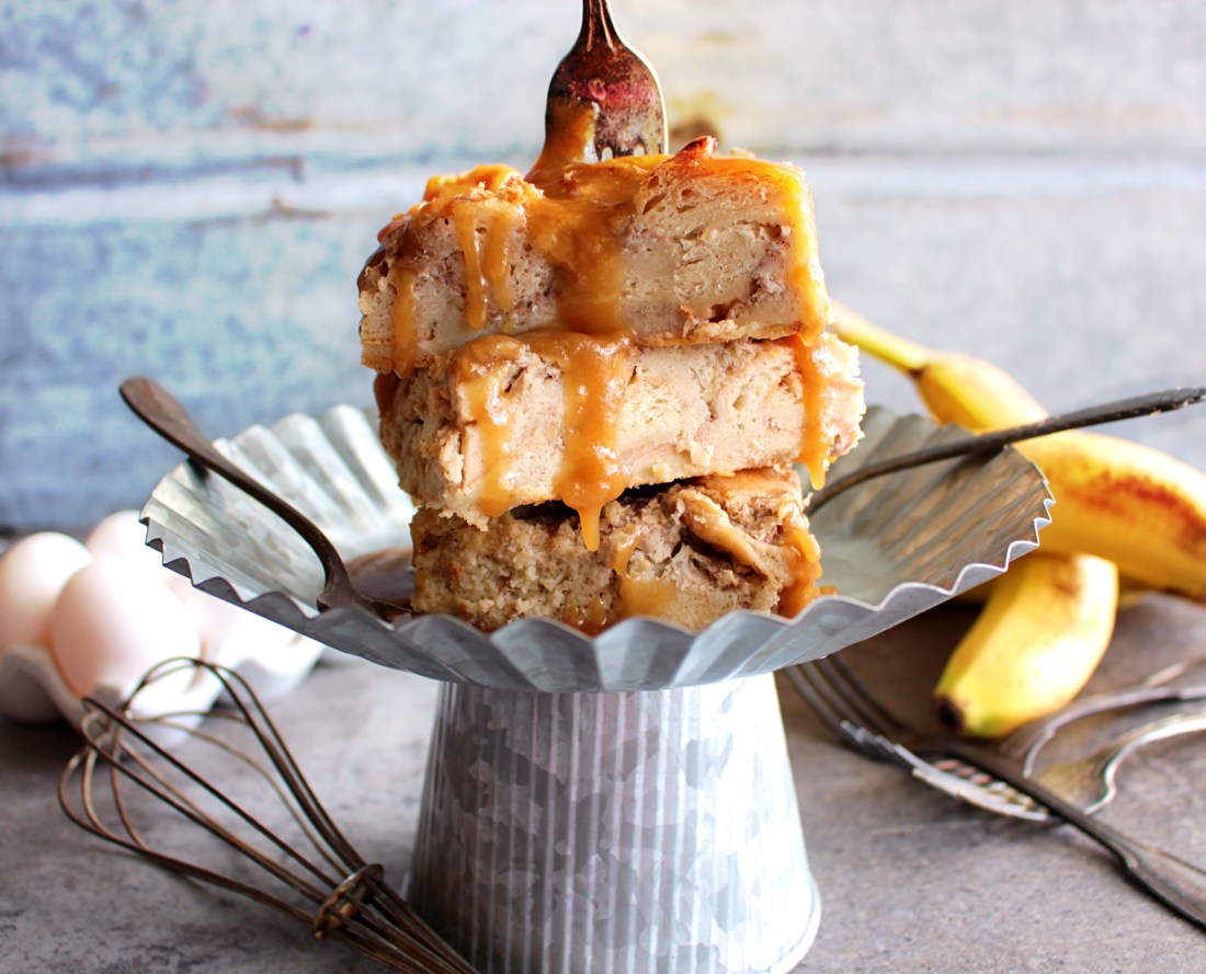 What do you make when you’re going to a picnic or backyard bash and need to feed a crowd of sweet-toothed maniacs? This banana-coconut bread pudding and salted caramel sauce is the answer. With a creamy custard center and crispy buttery edges, you can’t go wrong! This indulgence can be served gooey and warm or made a day ahead of time and served cold. The great part of making it a day ahead, is that it sets in the refrigerator so that you can get beautiful square cuts that are packed with banana-coconut goodness. Always serve the salted caramel sauce warm, but feel free to make this ahead of time too. Just heat it up quick in the microwave before serving.
