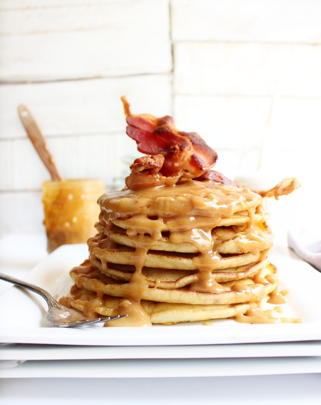 - Serve pancakes with maple-peanut butter syrup. Garnish with reserved bacon pieces and powder sugar {Don’t forget a BIG glass of milk}.