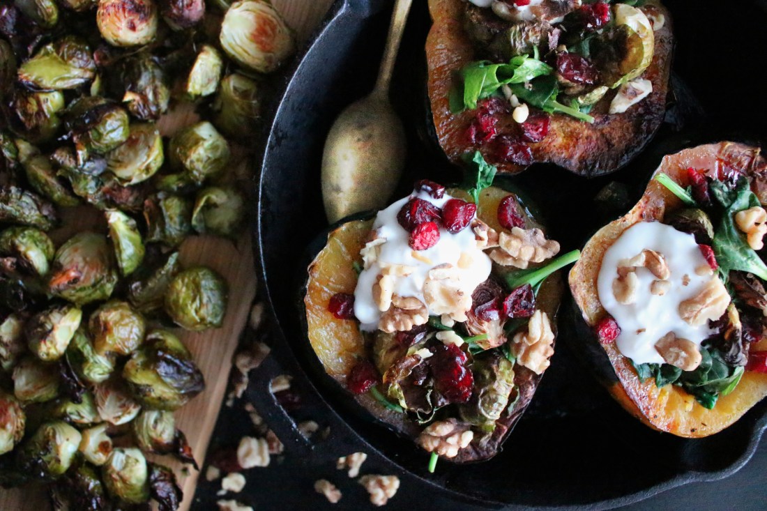- Assemble: Fill each squash half with a portion of the spinach and Brussel sprouts. Top with a dollup of sour cream, dried cranberries and toasted walnuts. Finish with a pinch of salt and pepper. {Eat left over Brussel sprouts as a side, they are super filling!}