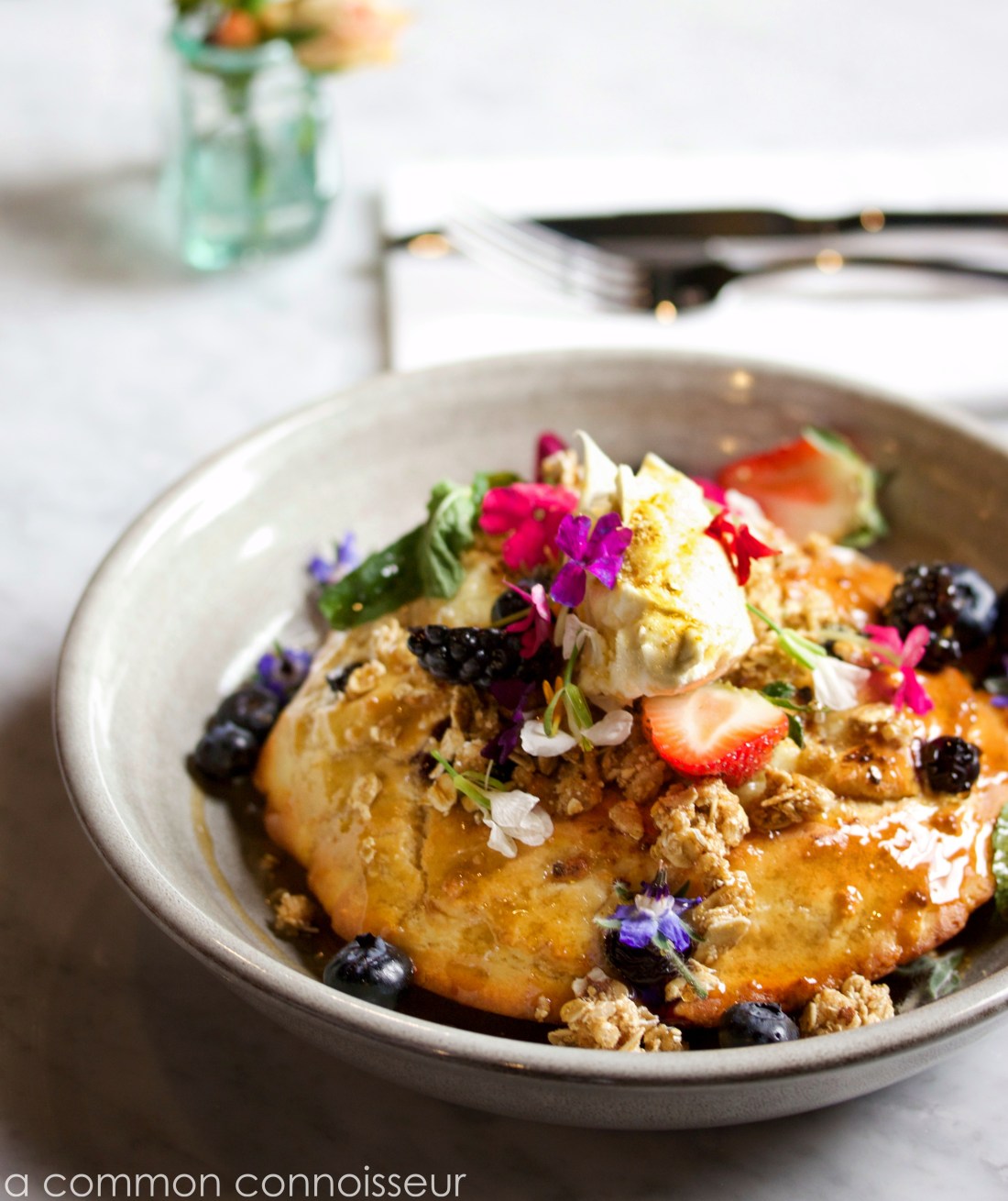 The hotcake is adorned with basil leaves, edible flowers, crunchy granola, succulent berries, whipped ricotta and a drizzle of maple syrup.
