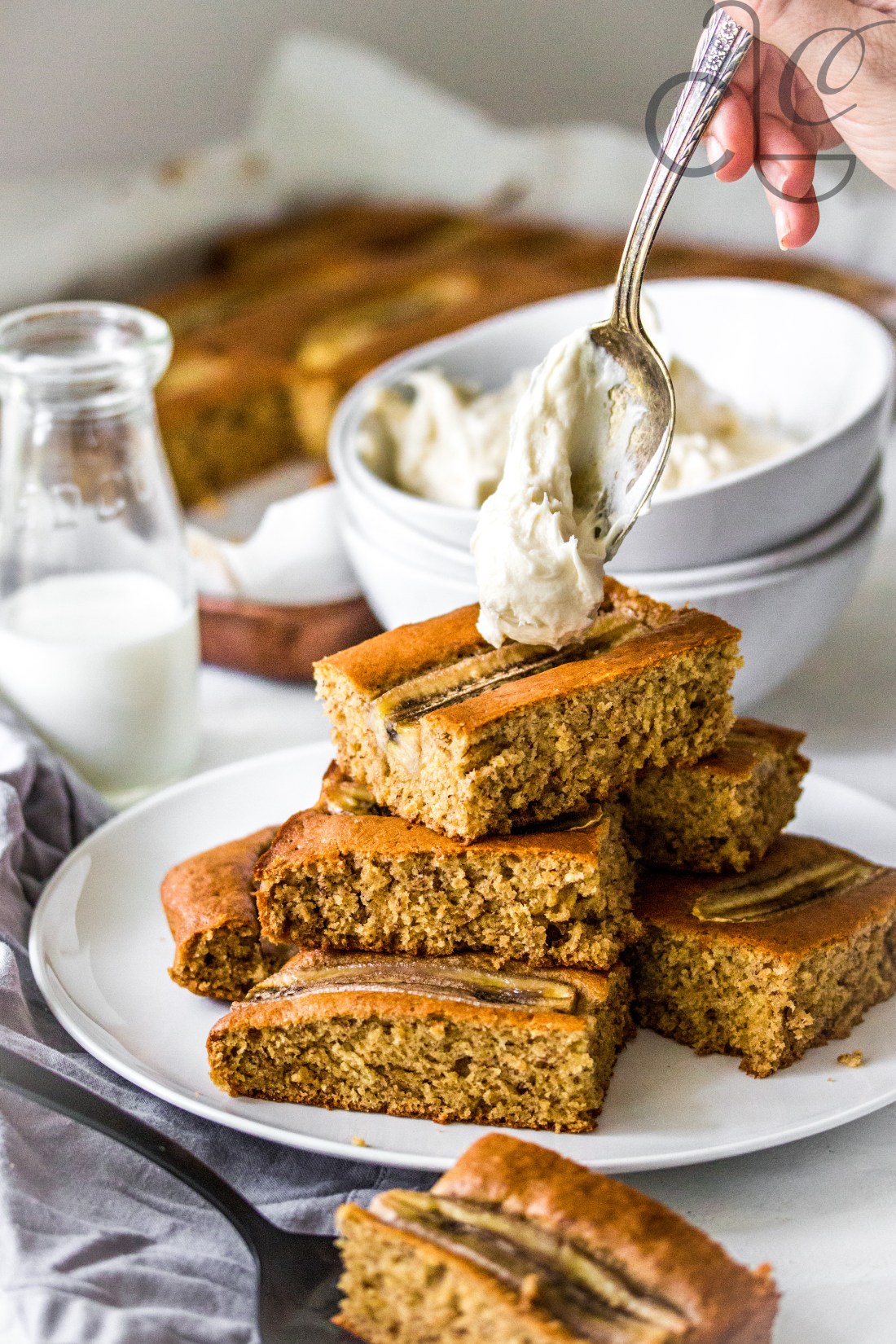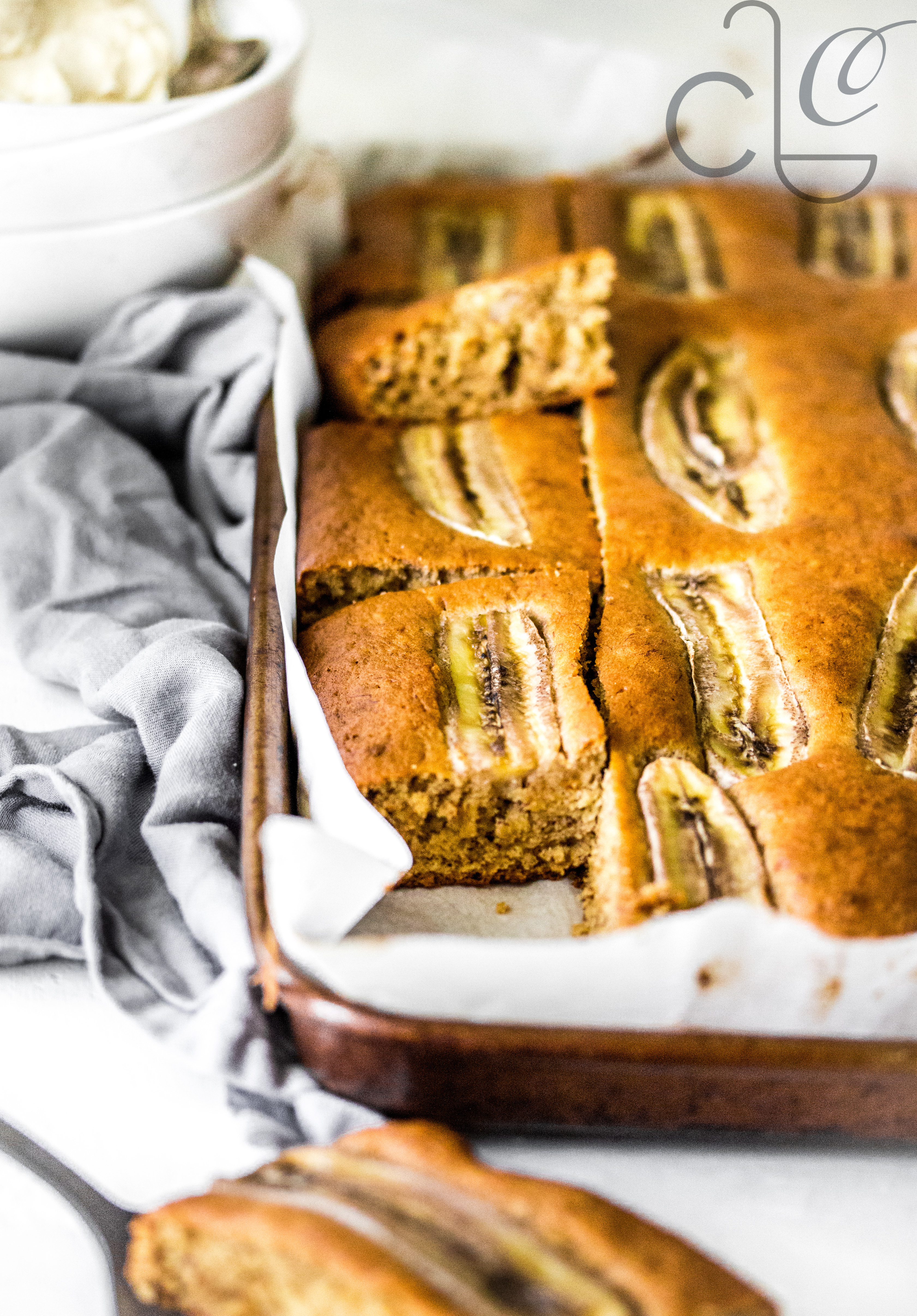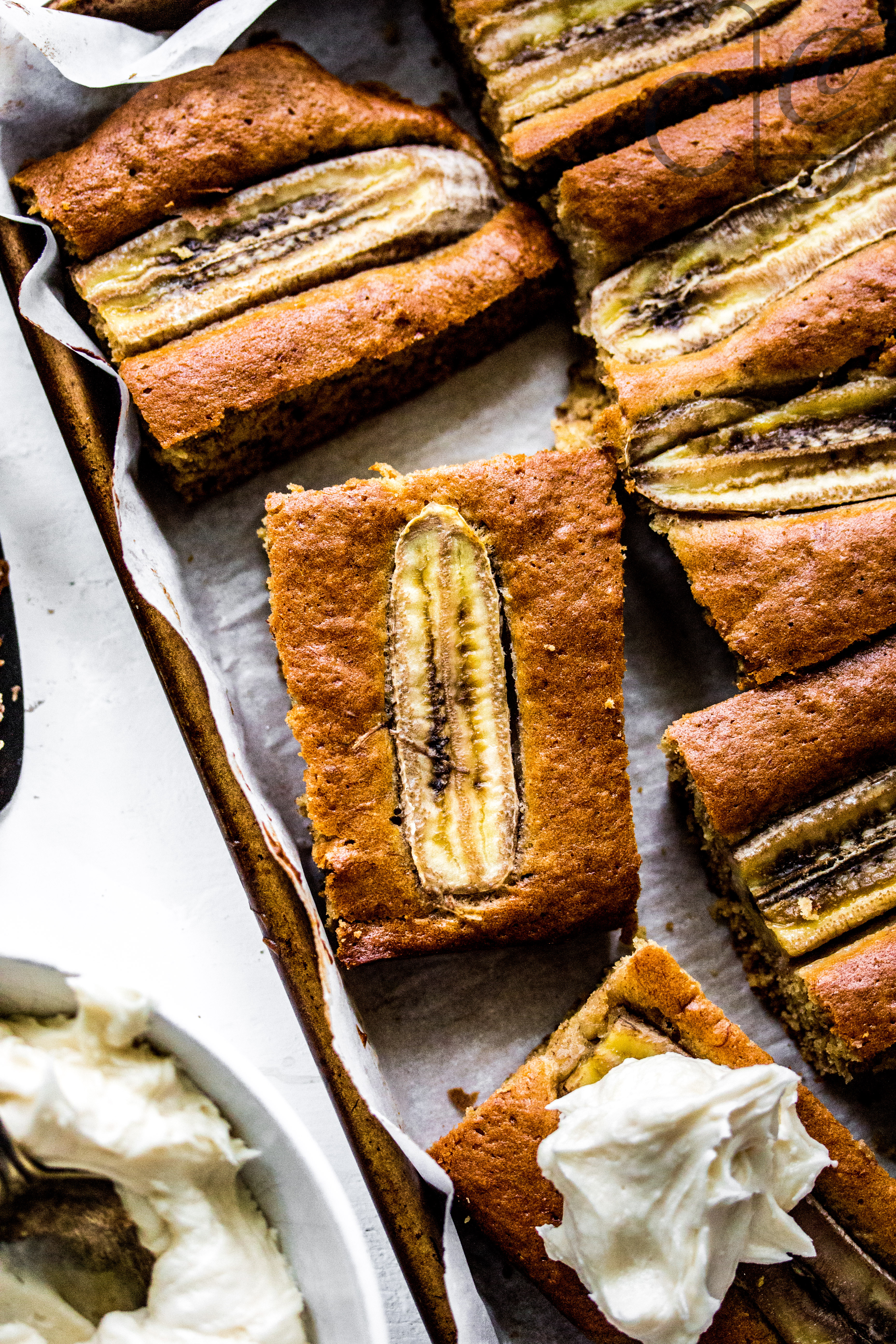 The first time I made this, I served it with Browned Butter Mascarpone Frosting (click for the recipe) and stacked it like a mini layered cake. Today, I decided to smooth out the batter into a sheet pan and lay fresh bananas along the top. With this method there is a whopping 9-10 bananas, which makes it incredibly moist and flavorful.