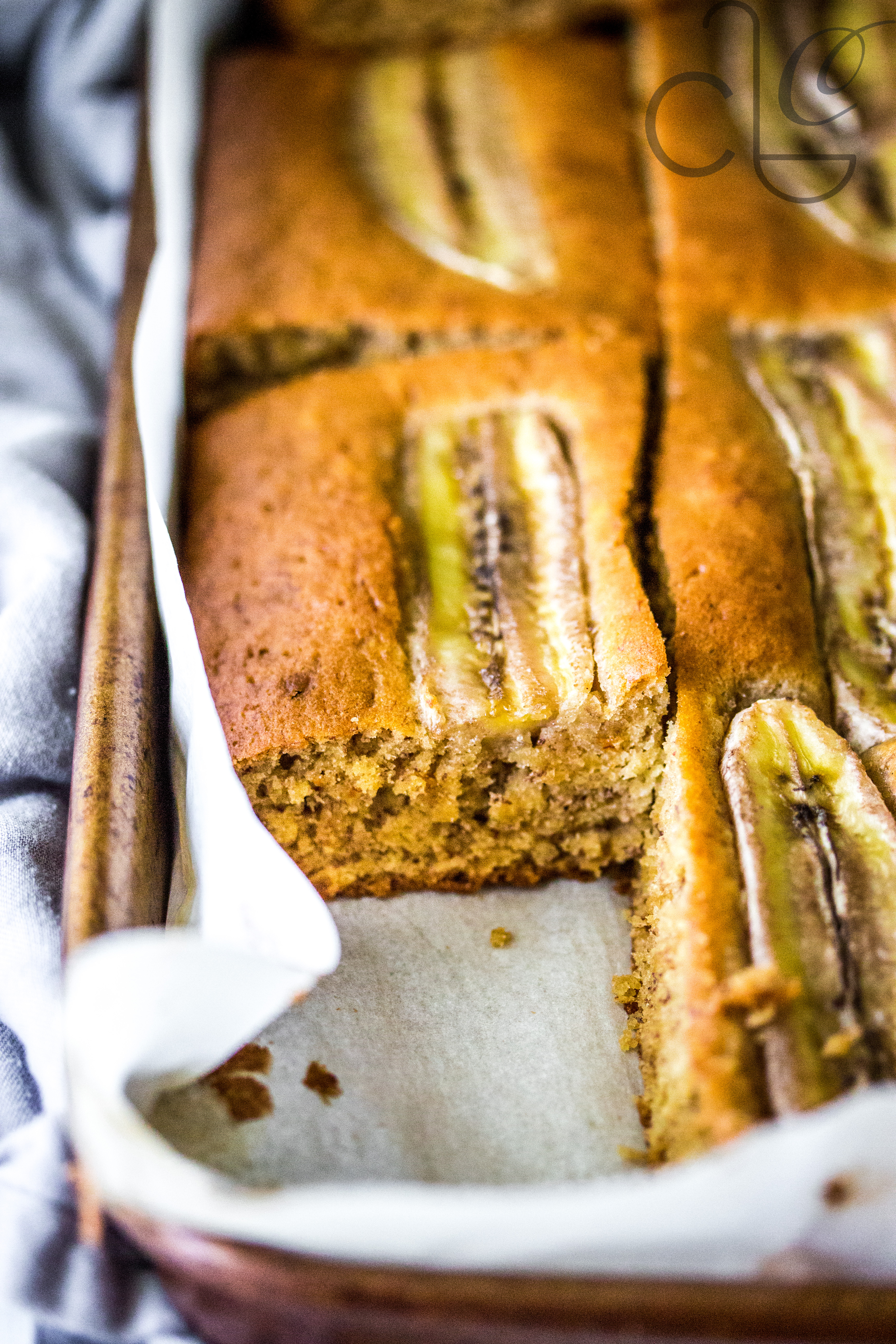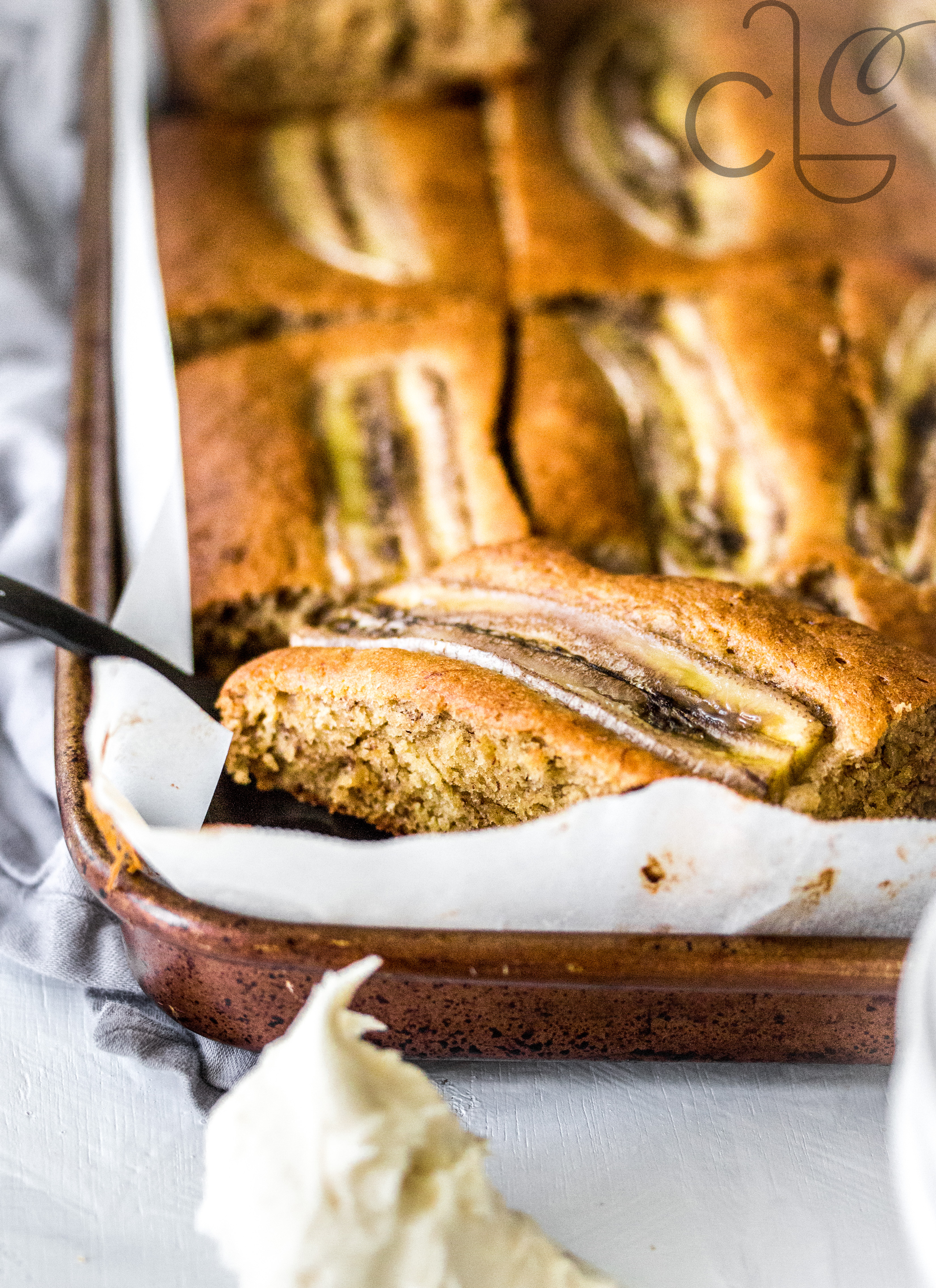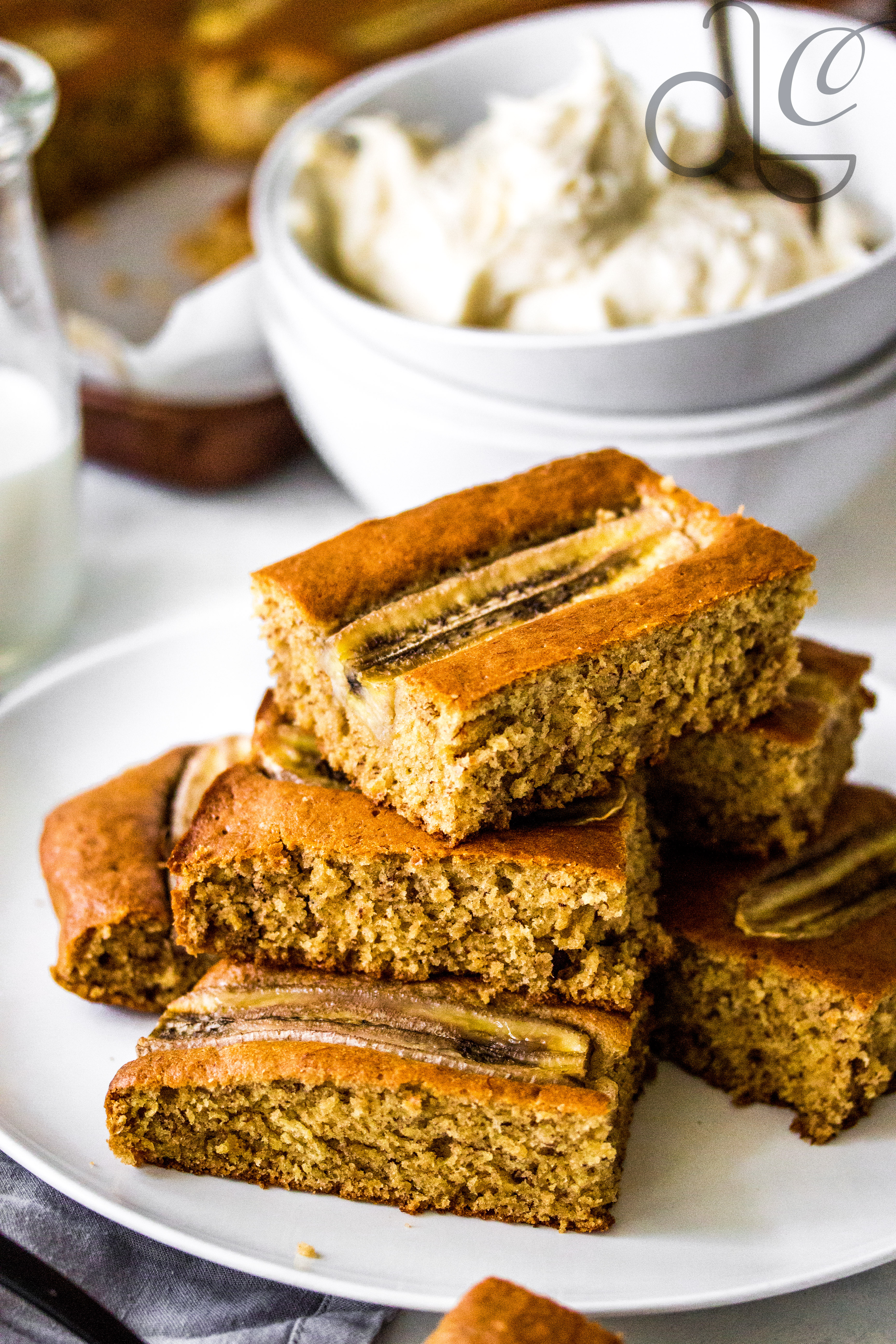 The first time I made this, I served it with Browned Butter Mascarpone Frosting (click for the recipe) and stacked it like a mini layered cake. Today, I decided to smooth out the batter into a sheet pan and lay fresh bananas along the top. With this method there is a whopping 9-10 bananas, which makes it incredibly moist and flavorful.