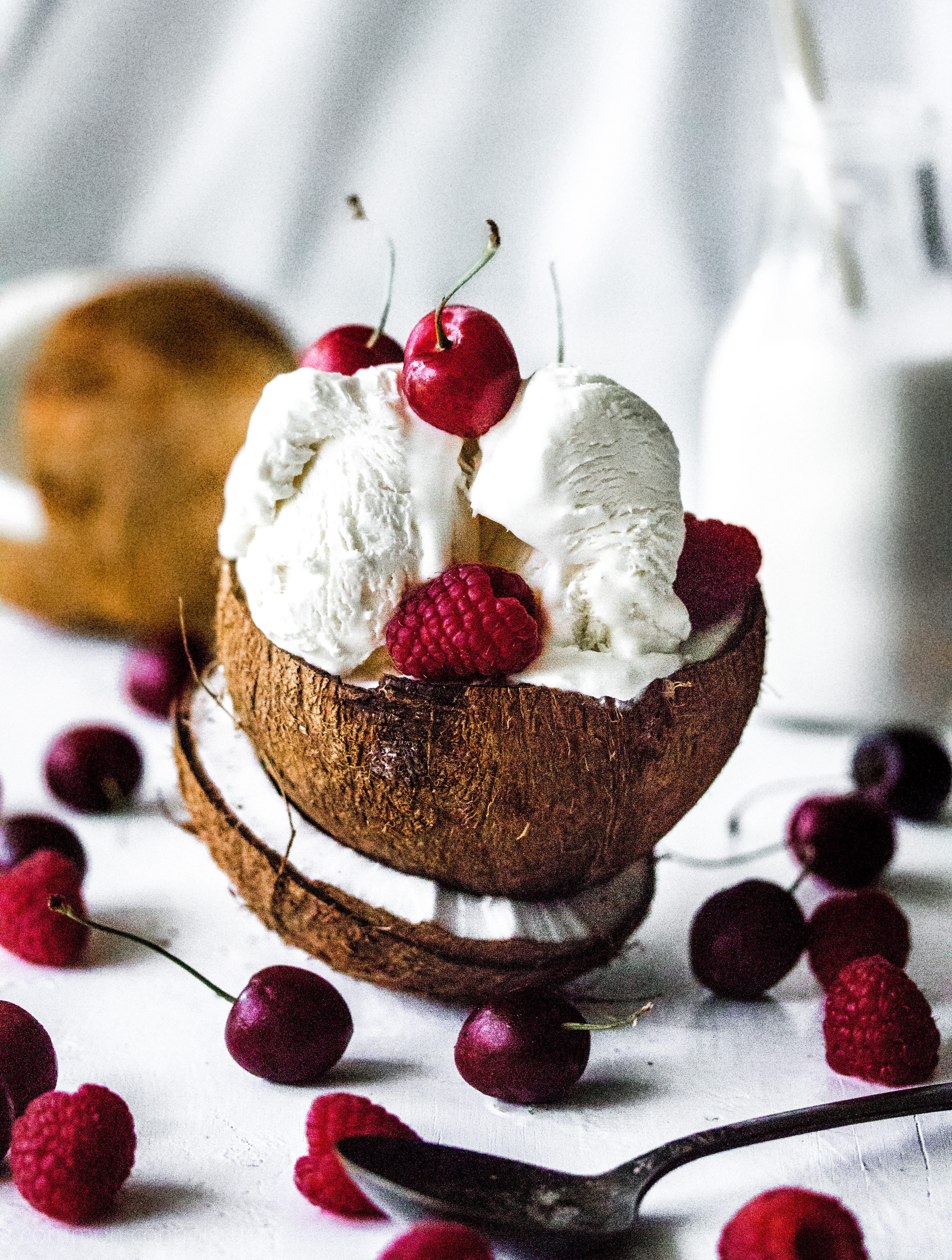 I could not be happier with the messy coconut ice cream shots. As a food photographer, composition of a photo is key. I was a fool and filled the bowl of ice cream prior to setting up the shot. Once I was fully ready, the ice cream was melting, the berries falling off and the bowl slowly tipping over. I was able to get the shot below before taking some of the mess. Weirdly enough, I fell in love with the messy shots. It gave a simply stunning sweet treat some life.
