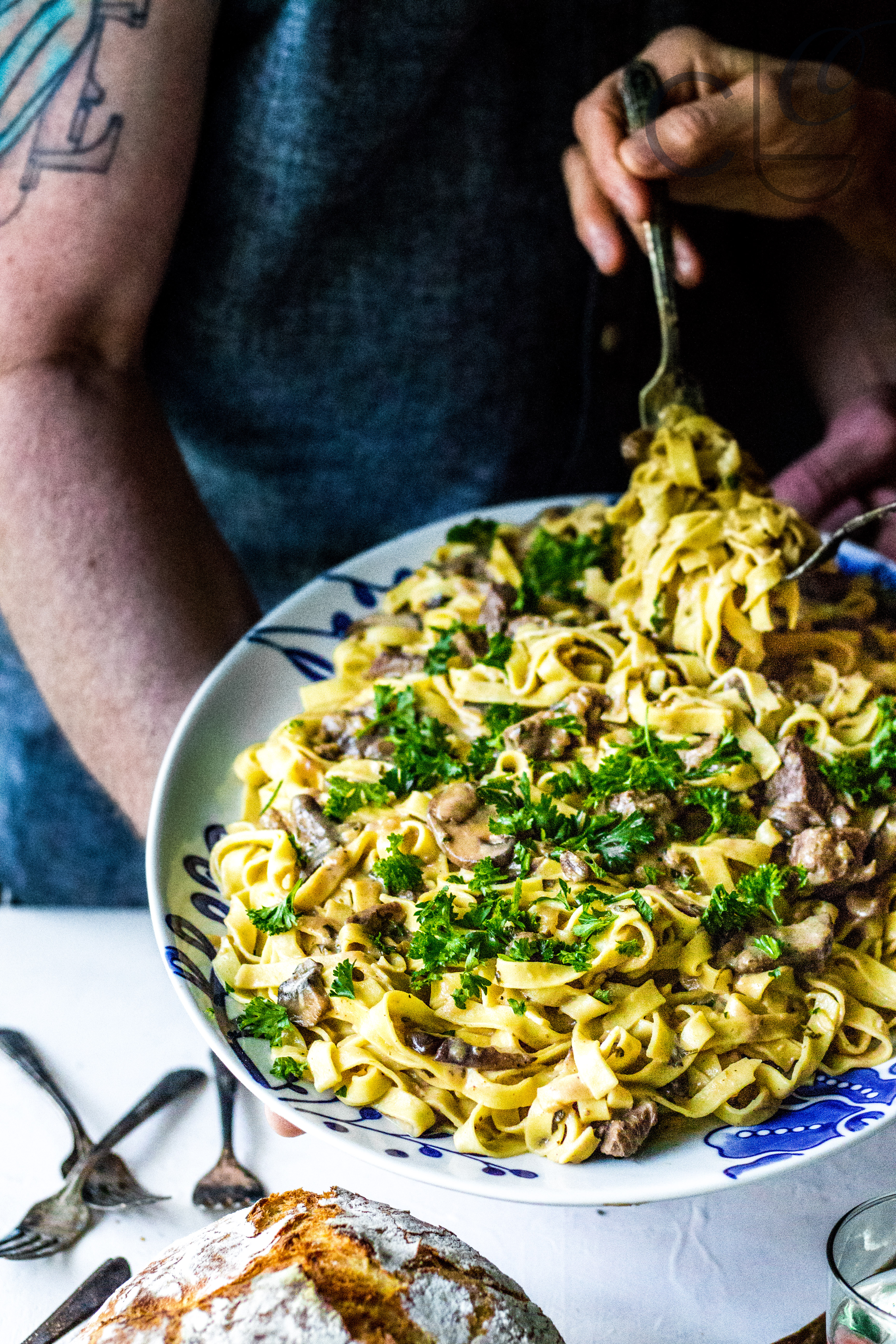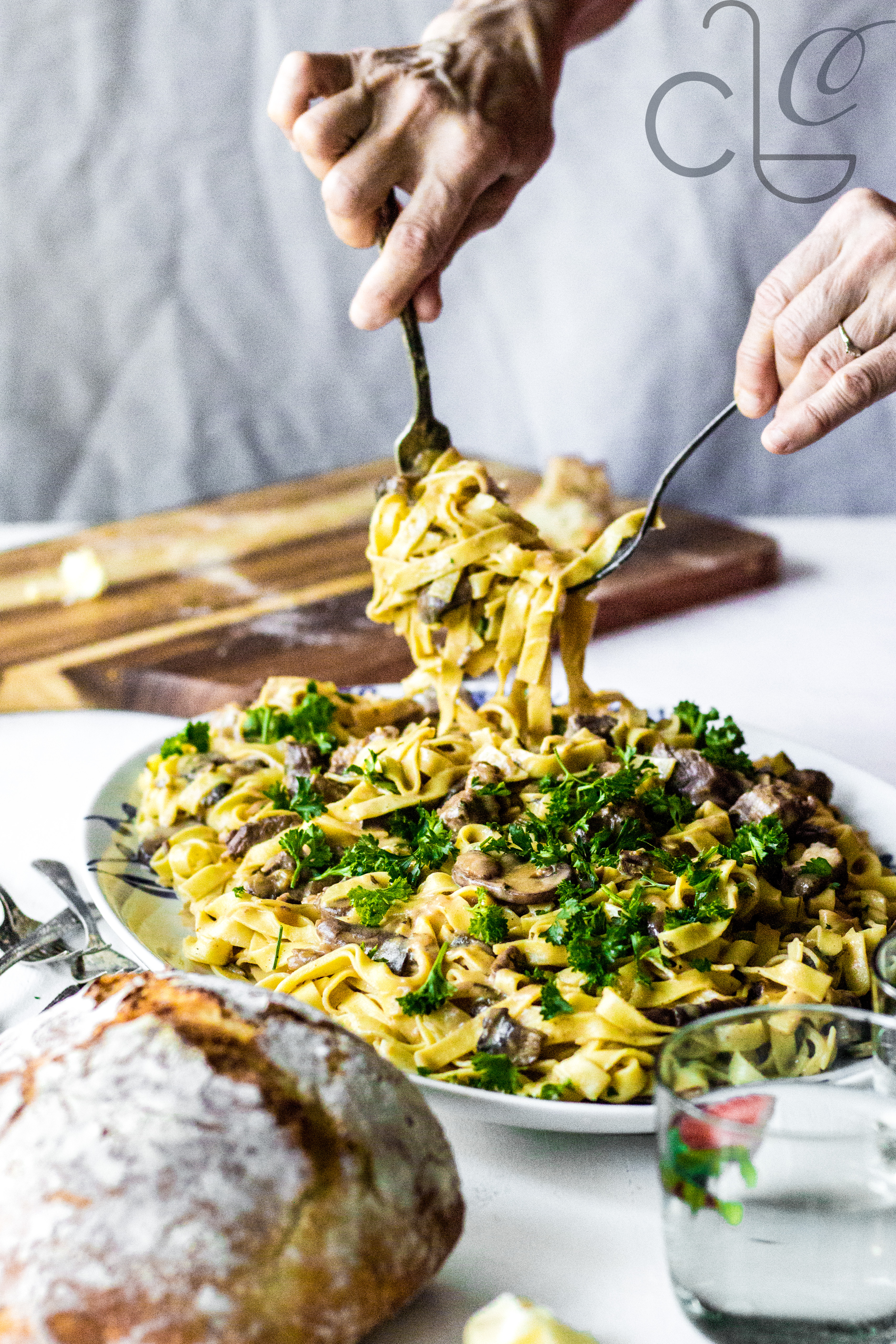 It’s creamy comfort with umami mushrooms and tender beef chunks. Fresh Homemade Pappardelle is THE BEST with it, so if you have time, go for it. We opted for making homemade Crusty Artisan Bread (no knead) and buy fresh pasta…our best kept secret.